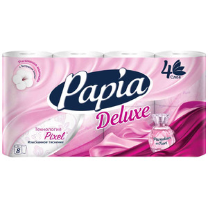 Туалетная бумага четырёхслойная Белая Delux, Papia 8 рулонов